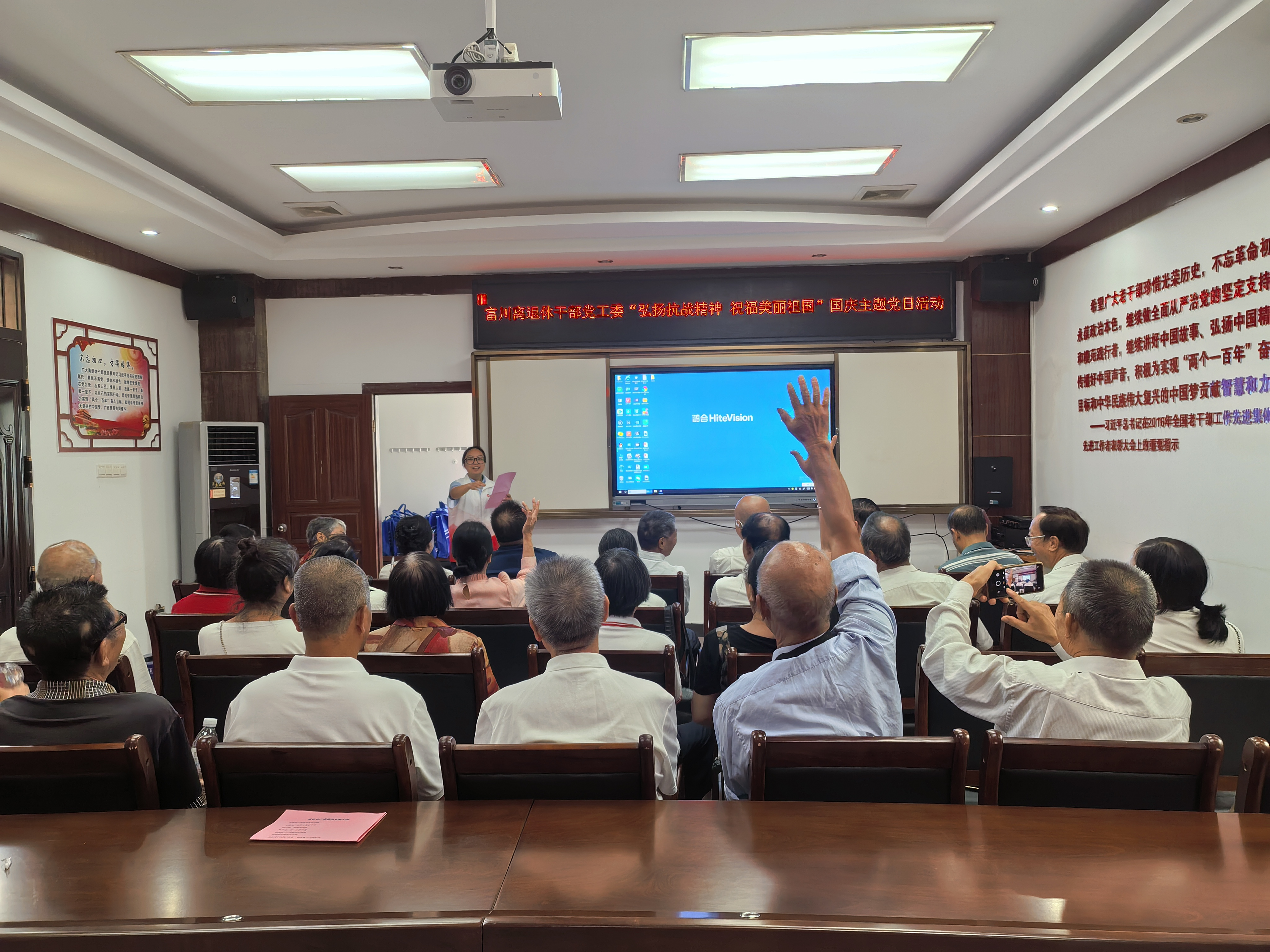 为庆祝中华人民共和国成立76周年,凝聚离退休干部党员奋进力量,9月29日,富川瑶族自治县离退休干部党工委联合桂林银行富川支行党支部举行“弘扬抗战精神  祝福美丽祖国”主题党日活动,28个离退休干部职工党支部的党员代表齐聚一堂,以赤诚之心为祖国献上生日祝福。
