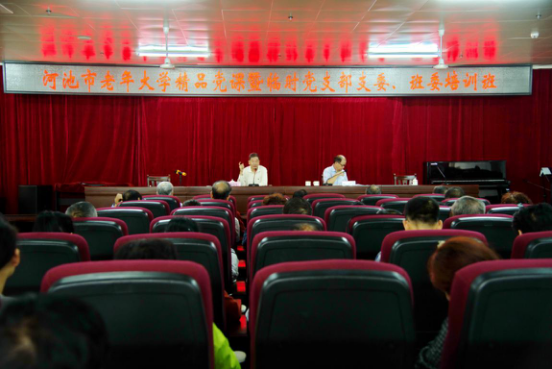 近日,河池市老年大学举办“老书记精品党课”活动,市政协原副主席、市老年大学校长朱发生作题为《不忘初心 牢记使命》的党课。老年大学全体教师、各班临时党支部支委、班委以及学员代表近200人到场聆听了党课。