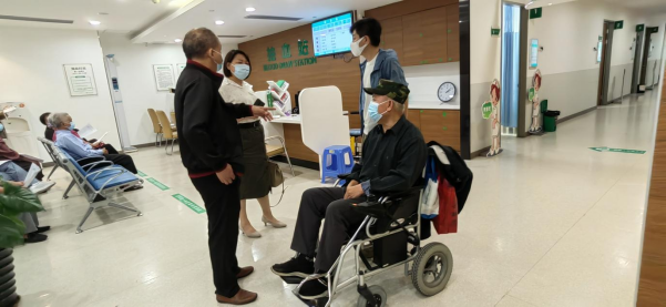 图为工作人员在挽扶老领导参加各项体检