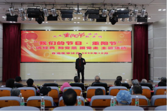 开展“我们的节日·重阳节”主题活动。老干部们个个精神饱满、热情洋溢,依次登场朗诵,抒发对党的拳拳热爱之情。朗诵内容以中华红色经典诗文为主,有《歌唱祖国》、《我骄傲,我是中国人》、《夕阳红》等弘扬爱国主义的经典诗文,热情讴歌了党的丰功伟绩;也有《审计之家》、《感悟人生》、《重阳节》等原创作品,记录下朗诵者的心路历程和感受。一首首红色经典诗词铿锵有力,一篇篇原创诗文热情奔放,老干部们用不同的方式抒发了对党的无限热爱和坚定跟党走的信心决心。