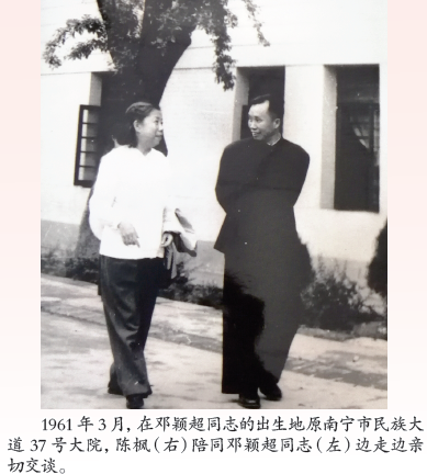 1961年3月,邓颖超出访越南回南宁的第三天,在时任中共南宁市委书记的父亲陈枫与自治区副主席覃应机、市妇联副主任范芳训等陪同下,来到自治区政协大院(原民族大道37号后为南宁市政协大院),认访她 1904年在南宁的出生地。