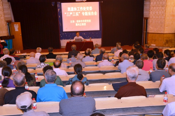 10月27日,离退休工作处党委、老干部党校在正平科技馆举行“三严三实”专题报告会,特邀请桂林市委党校粟尚正教授作专题辅导报告,离退工作处党委在职和离退休党员参加了报告会。
