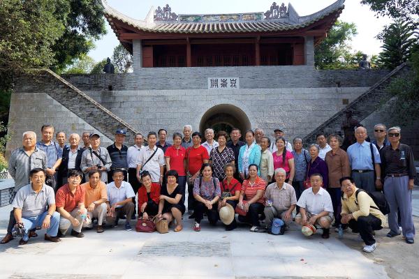 图为老干部在参观昆仑关的古关楼前合影