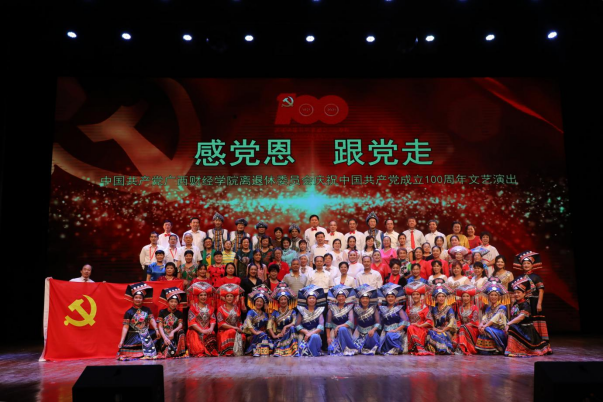 为庆祝建党100周年,6月29日上午,广西财经学院离退休党委在明秀校区一号礼堂开展“感党恩 跟党走”庆祝中国共产党成立100周年文艺演出。学校党委书记韦春北、党委副书记韦泽红、学校二级基层党组织代表、离退休党员、离退休教职工200多人观看了演出。参加本次演出的有离退休各党支部、学校老年大学和崇左市老年大学,共260多名演员。