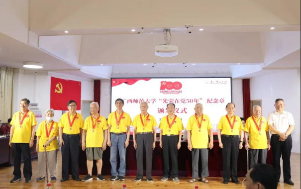 近日,广西师范大学在王城校区学术报告厅开展了“光荣在党五十年”纪念章颁发活动。校党委书记邓军、校党委副书记旷永青、校党委常委组织部长林国庆出席颁发仪式,260余名老党员参加了这场具有特殊历史纪念意义的活动。