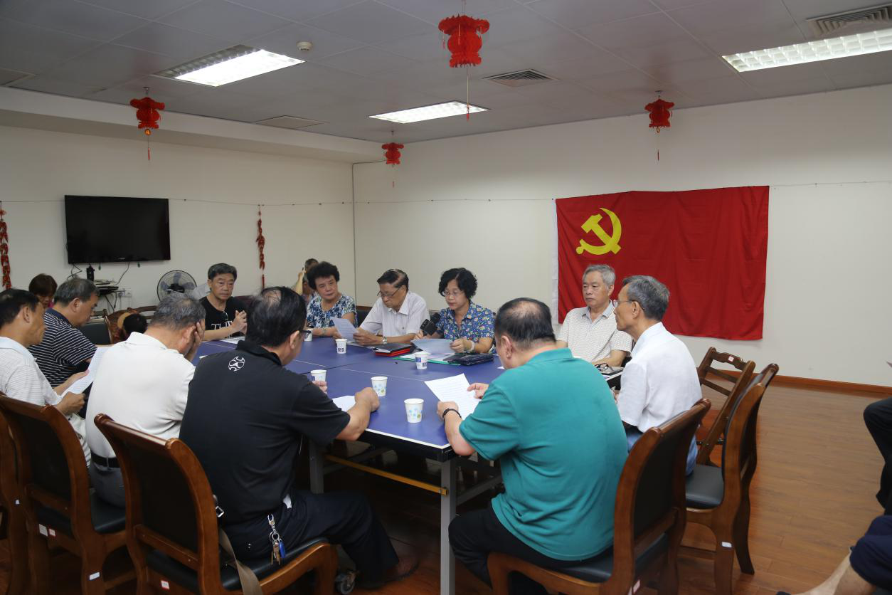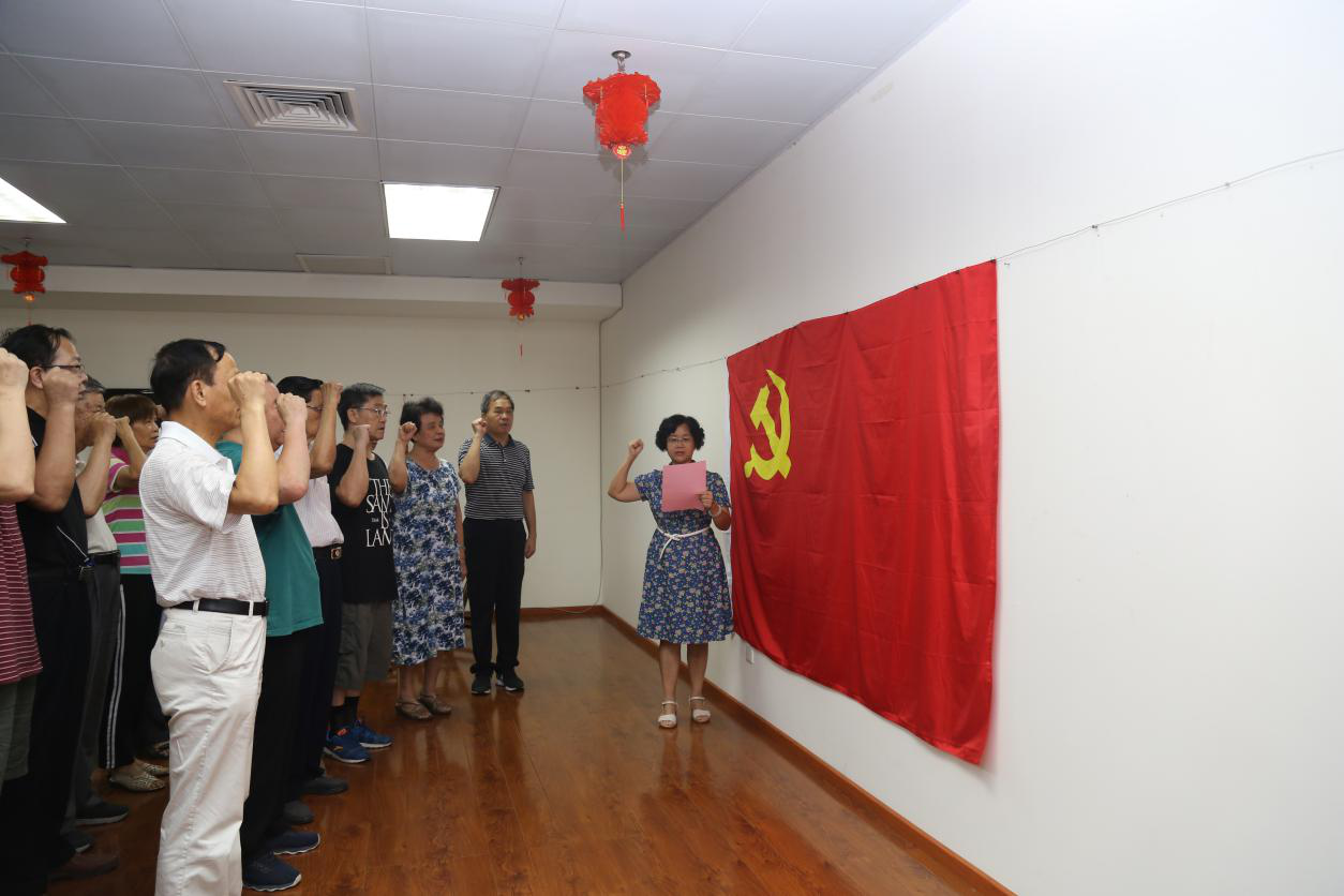 重温入党誓词。7月2日下午,离退休党总支组织老党员、老同志开展“不忘初心、牢记使命”主题教育,全体党员面对鲜艳的党旗,再次举起右手,庄严地重温了入党誓词,大家齐唱《没有共产党就没有新中国》红歌。