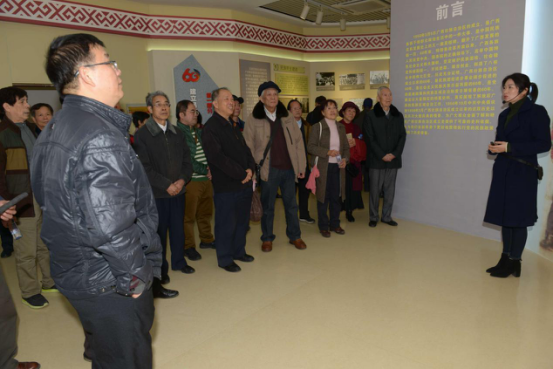 老同志们参观新中国工业档案文献展。 老同志们听取展馆工作人员介绍。