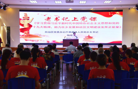 近日,自治区党委办公厅开展“老书记上党课”活动,办公厅离退休人员党总支书记陆地宏给厅离退休干部党员、第五党支部和机关保育院在职党员共90多人上党课。