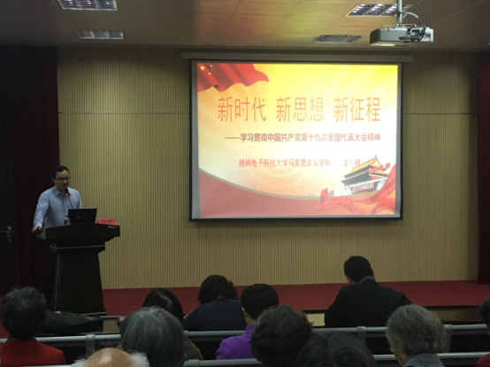 5月9日上午,桂林电子科技大学举行 “新时代 新思想 新征程 ——学习贯彻中国共产党第十九次全国代表大会精神”宣讲会。校党的十九大精神宣讲团讲师、马克思主义学院龙小峰博士受邀宣讲。学校100多名老同志、老党员和离退休工作处全体职工参加会议。