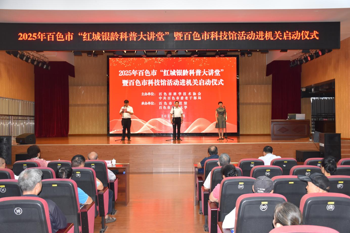 4月29日,由百色市委老干部局、市科协联合主办,市科技馆、市老年大学共同承办的百色市“红城银龄科普大讲堂”活动在市老年大学举行。市委组织部副部长、老干部局局长黄光源,市直部分厅级退休老领导、各单位离退休干部党员代表,市老年大学学员代表等120余人参加活动。