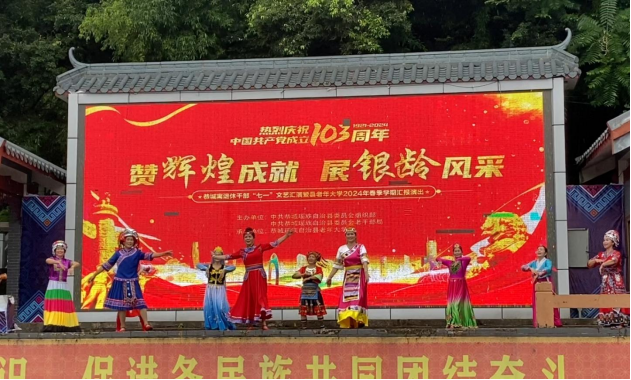 为庆祝中国共产党成立103周年,展现新时代离退休干部不忘初心跟党走的坚定信念和昂扬向上的精神面貌,6月30日,桂林市恭城瑶族自治县举办“赞辉煌成就 展银龄风采”离退休干部庆“七一”文艺汇演暨老年大学2024年春季学期汇报演出,1000余名离退休干部欢聚一堂,向伟大的中国共产党致以深情的祝福,向美丽的祖国致以美好的祝愿。