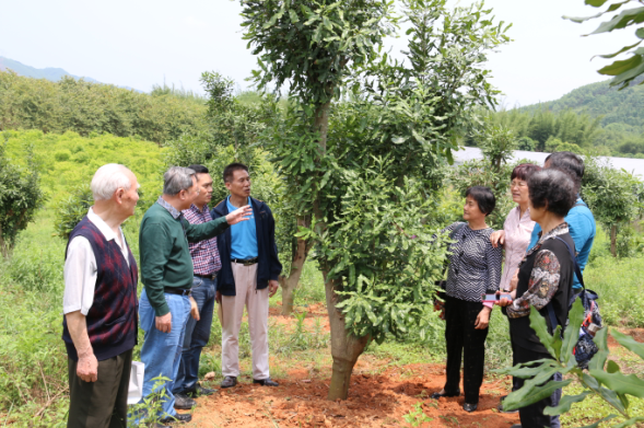 图为老干部和老专家调研新引进的澳州坚果林