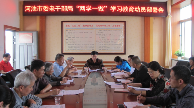 4月28日,河池市委老干部局召开“两学一做”学习教育动员部署会。河池市委组织部副部长、老干部局局长罗平作动员部署。局机关、市干休所全体干部职工,离退休老党员和住干休所老党员代表等20人参加了会议。