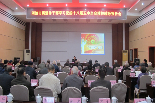 12月2日,河池市离退休干部集中学习党的十八届五中全会精神。市人大常委会副主任银建军为离退休干部作辅导报告。他从“十三五”时期经济社会发展指导思想、主要目标、基本理念,“十三五”时期各项发展任务和重大决策部署等方面对十八届五中全会精神作了深入阐述和解读。