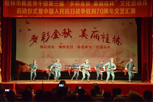 10月9日上午,桂林市在广西师大王城校区礼堂举行离退休干部第三届“多彩金秋美丽桂林”启动仪式暨庆祝中国人民抗战胜利70周年文艺汇演,拉开了文化活动月的帷幕。来自各县(区)共500余名离退休干部参加演出。