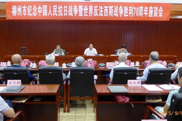 9月17日上午,柳州市在文昌会议中心召开纪念中国人民抗日战争暨世界反法西斯战争胜利70周年座谈会,曾经参加抗战的老战士、老同志,与青少年学生、驻柳部队官兵、党政机关工作人员齐聚一堂,重温抗战历史,弘扬抗战精神。