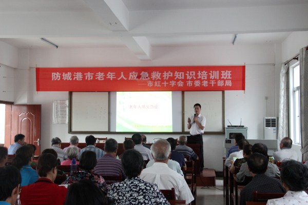 9月14日,防城港市委老干部局联合防城港市红十字会在市老干部活动中心举办老年人应急救护知识培训班,邀防城港市第一人民医院分院急诊科主任陈志宏授课,共100多名老干部参加。