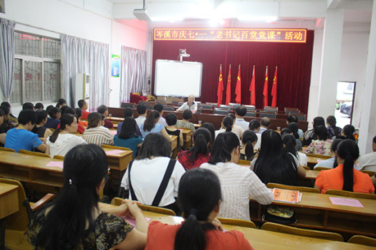 在建党97周年到来之际,岑溪市委老干部局开展“老书记百堂党课”到基层进学校活动。现年76岁高龄的岑溪市人民政府原市长、岑溪市人大常委会原主任江涛,给来自市委组织部、老干部局、教育局、发改局、旅游局、社科联、市职中学校等“双报道”单位的100多名党员上了一堂生动的党课。