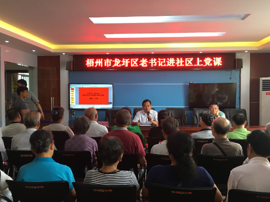 近期,梧州市委老干部局、龙圩区委老干部局结合“不忘初心、牢记使命”主题教育,在龙圩区开展“老书记进社区上党课”活动,邀请市老干部党校宣讲团成员、“老书记上百堂党课”的授课人万秀区人大常委会原主任卢坚雄、市残联原党组书记梁锋、市委党校原副教授吴瑜倩以及龙圩区退休老领导李达强、程为禄等,为龙圩区各社区近300名离退休干部党员和群众宣讲党课。没有空话套话,只有真话实话,老书记的宣讲内容从“高大上”变得“接地气”。“大家既要做政治上的明白人,也要做社区工作的热心人”,“要积极参加社区活动,在满足社区居民服务需求、融洽社区居民关系中发挥作用,做到革命路上不停步,发挥余热做贡献。”