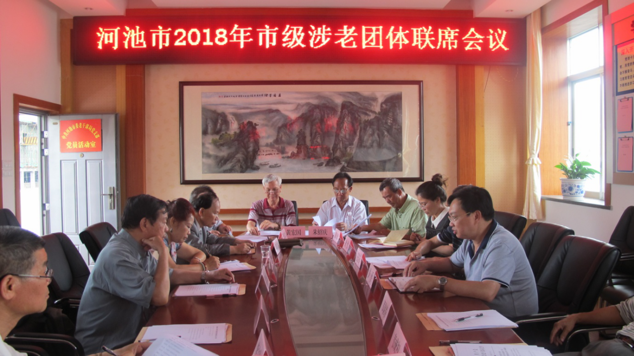 5月22日,河池市委老干部局召开市级涉老团体联席会议,传达学习2018年全区离退休干部为党和人民的事业增添正能量活动方案,通报开展“唱响壮乡新时代”山歌传唱、“图晒八桂美”摄影活动有关要求,安排部署2018年河池市正能量活动。