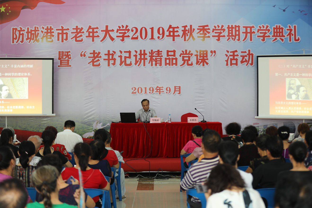 9月2日,防城港市老年大学举行2019年秋季学期开学典礼暨“老书记讲精品党课”活动。防城港市委组织部副部长、老干部局局长杨洪波出席开学典礼并讲话,市委老干部局副局长张新练主持典礼。市老年大学教师、学员代表约300人参加活动。