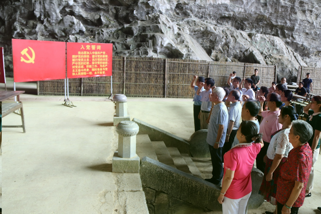 老同志们兴致勃勃地参观考察了都安县瑶山牛扶贫产业示范区、环江县木论喀斯特生态园区、广西丹泉酒业有限公司等,每到一处,他们都认真听取情况介绍,详细询问脱贫攻坚、企业发展现状,相互交流意见建议。还到列宁岩、魁星楼、韦拔群纪念馆等红色教育基地接受红色教育。在列宁岩,离退休干部党员面对鲜红的党旗重温入党誓词,重新接受心灵洗礼。在韦拔群纪念馆,老同志们聆听讲解,查看革命烈士珍贵的文物资料,缅怀革命烈士的丰功伟绩,感受韦拔群的革命精神。老同志们怀着深深的敬意,向韦拔群烈士墓、革命烈士纪念塔敬献花篮,默哀致敬,表达了无限哀思与崇高敬仰。
