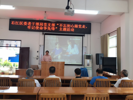 7月15日,右江区委老干部局党支部开展“不忘初心跟党走,牢记使命争先锋”主题活动,组织党员们观看了百色市乐业县百坭村第一书记黄文秀先进事迹视频,学习了习近平总书记在“不忘初心、牢记使命”主题教育工作会议上的讲话和对黄文秀同志先进事迹做出的重要指示精神。