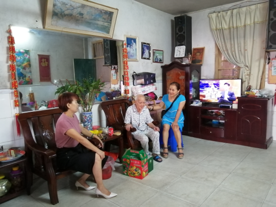 南丹县委副书记唐焰(居中)看望慰问县水电公司退休支部困难党员莫永标(右)。
