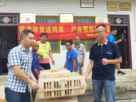 柳南区委组织部副部长、老干部局局长王朝权、柳南区离管中心主任蒙裕寿向扶贫对象捐赠鸡苗。