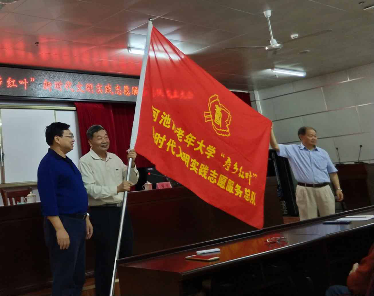 会上,罗平代表市委老干部局向朱发生、韦贵生等老年志愿者代表授河池市老年大学“寿乡红叶”新时代文明实践志愿服务总队队旗。河池市老年大学“寿乡红叶”宣传教育志愿服务队队长蓝璇、文艺活动志愿服务队队长陈国锋、健身体育志愿服务队副队长陈树萍接过队旗,成为河池市老年大学“寿乡红叶”新时代文明实践志愿服务总队旗下的一支队伍。