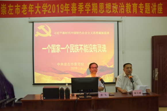 5月27日,崇左市老年大学邀请市委党校副教授农飞作题为《一个国家一个民族不能没有灵魂》的思想政治教育专题讲座。崇左市委老干部局副局长兼市老年大学副校长蒋三成主持,市老年大学副校长方燕琼及学校各科室负责人、声乐22班全体学员参加讲座。
