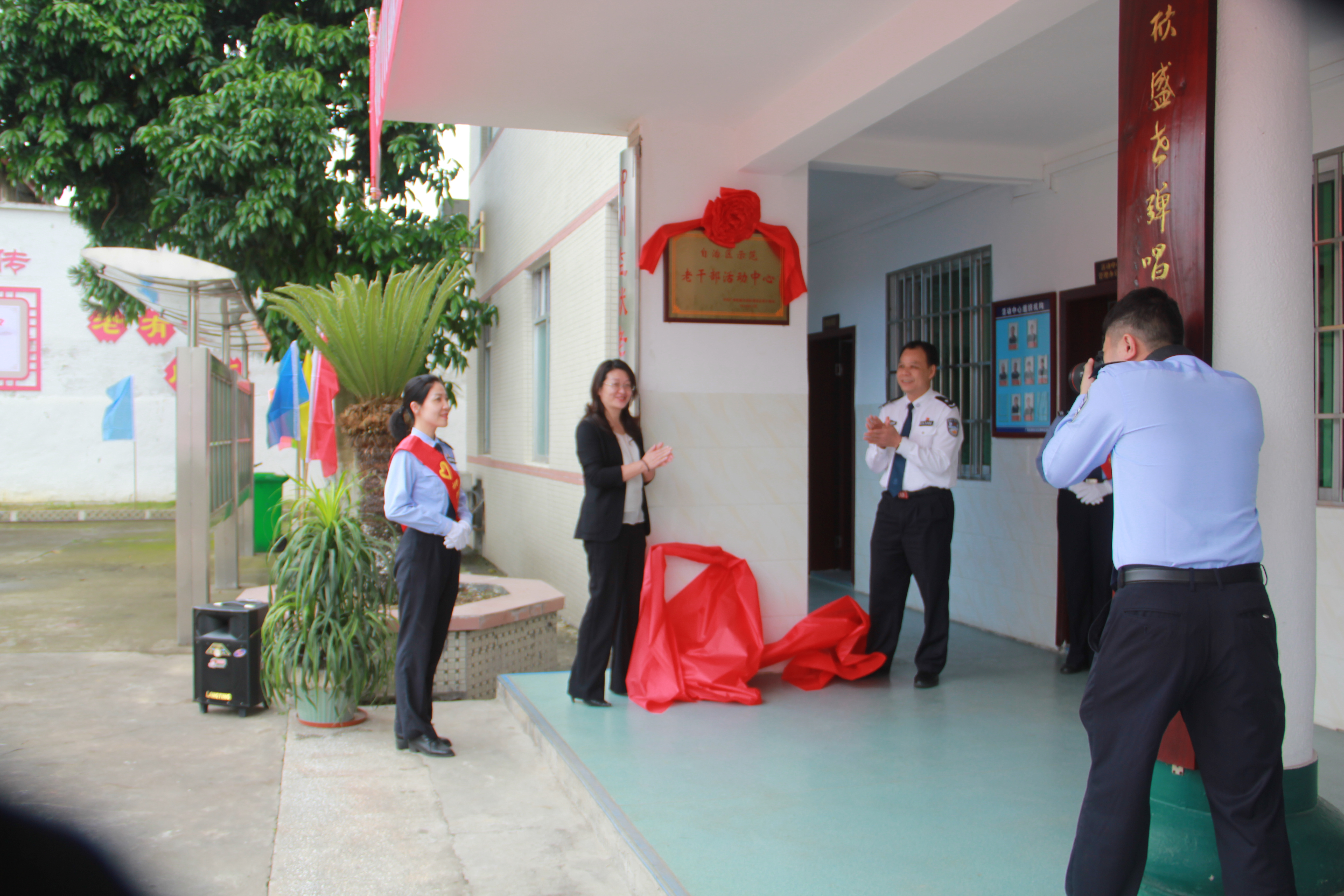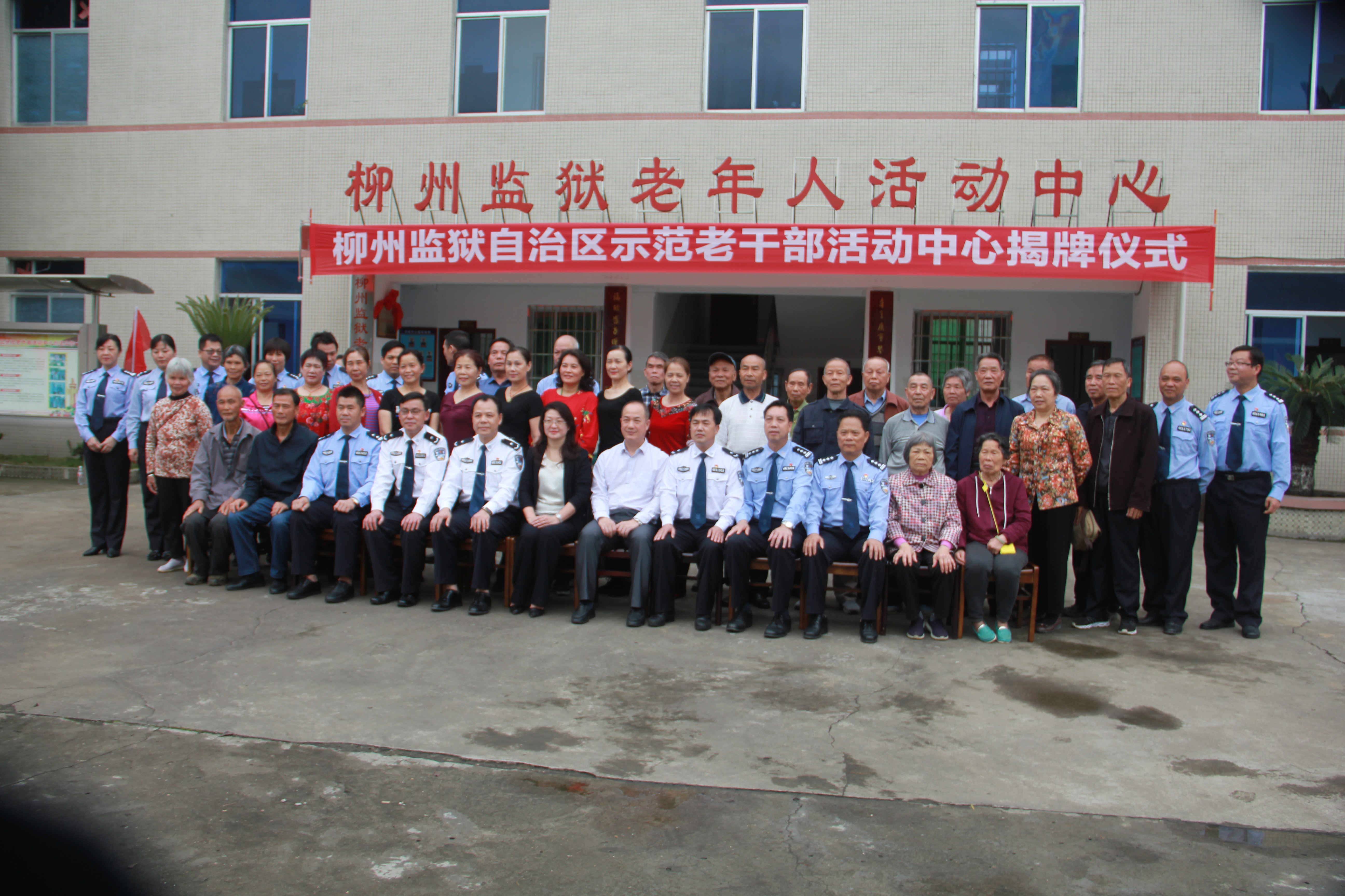 5月9日,自治区监狱管理局党委委员、副政委赖伟容和柳州监狱党委书记、监狱长戴广寿为柳州监狱老年人活动中心荣获的自治区示范性老年人活动中心揭牌。