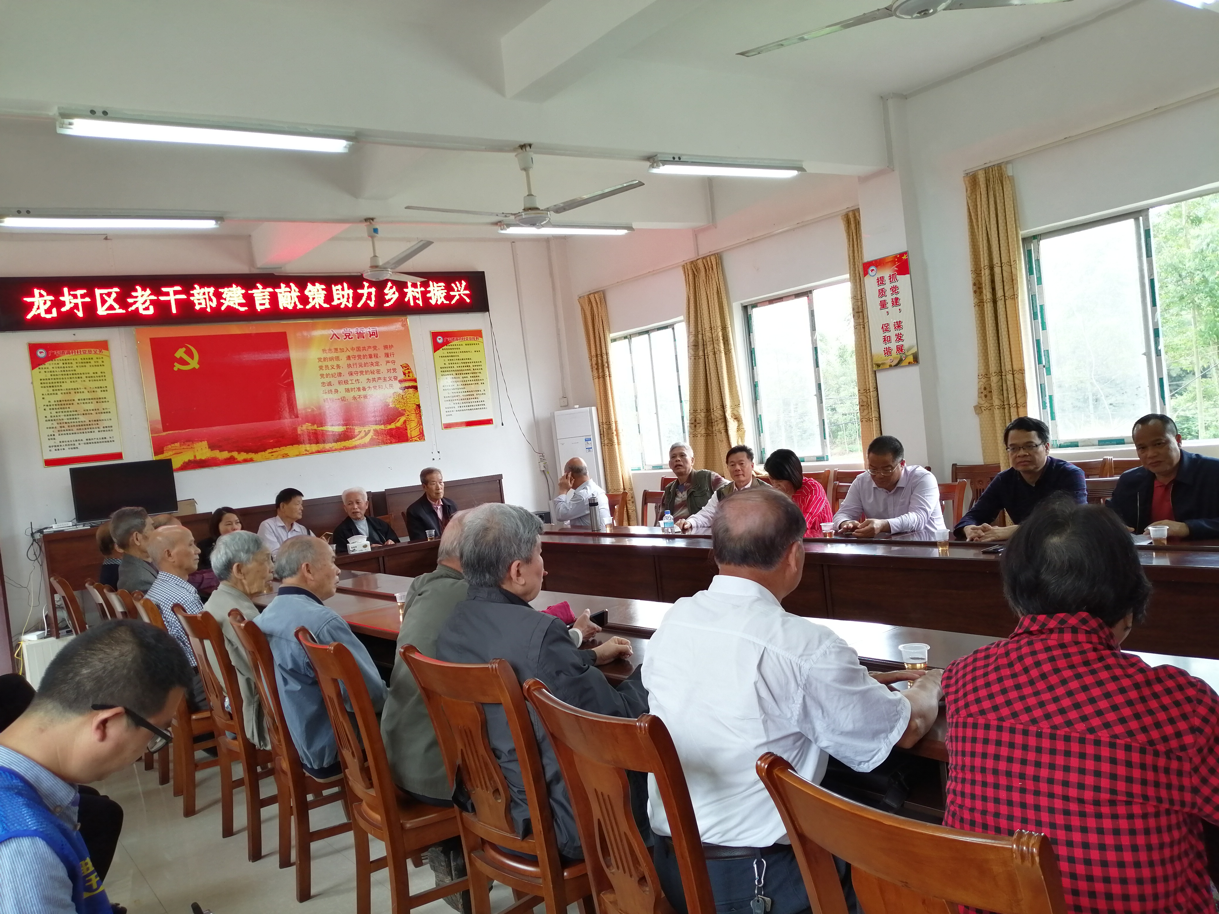 老同志们在调村村委会召开座谈会。会上,龙圩区政协农业农村和经济联谊委员会主任郭木森介绍了调村作为红色旅游基地的历史由来,黎锦坚书记介绍了该镇各项工作开展情况,重点介绍振兴乡村和脱贫攻坚方面的情况。龙圩区政协主席李国对老同志离退休后仍关心龙圩区的经济发展表示感谢,希望老同志能够一如既往支持龙圩区的各项工作。老同志们在会上积极为广平镇建设发展出谋献策,提出,希望加大红色旅游基地宣传力度,增加知晓率;推广种植沃柑;打造特色产业稻螺养殖、温氏养鸡与红色旅游基地相结合,带动经济发展。