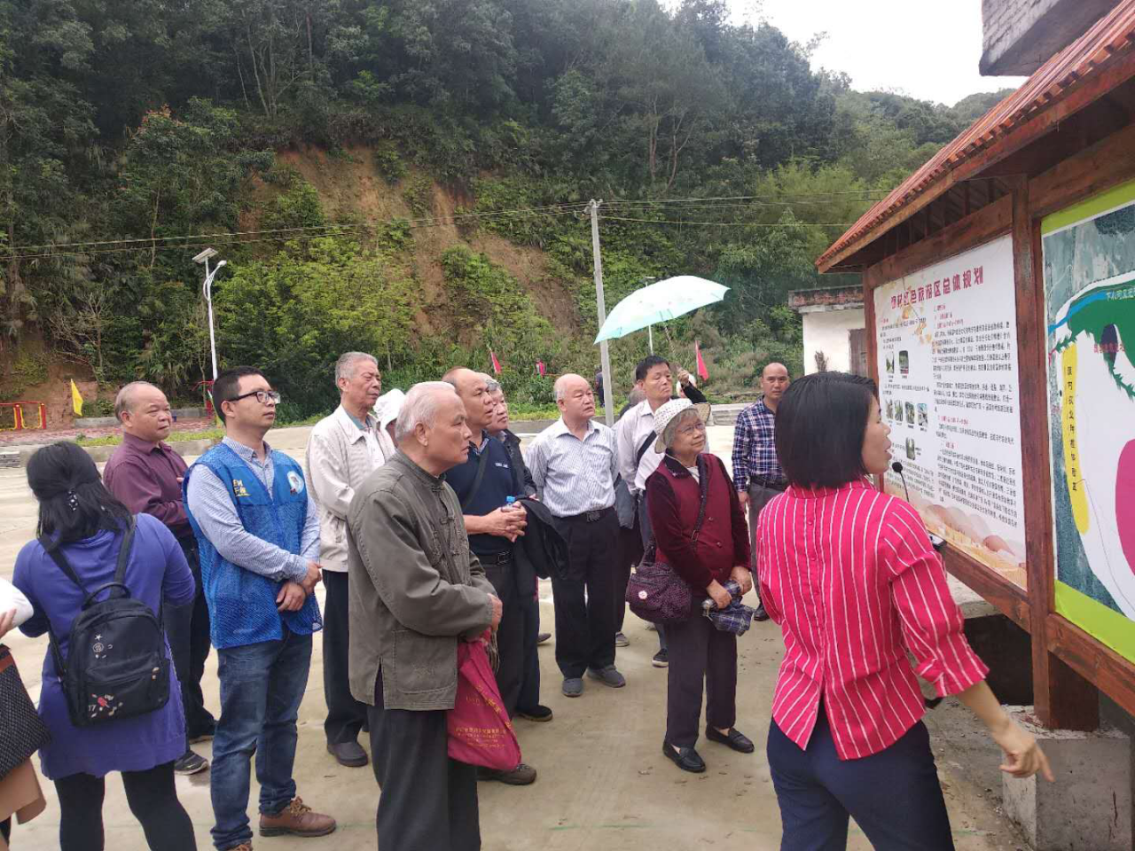 老同志们听取广平镇党委书记黎锦坚介绍调村红色旅游基地情况。