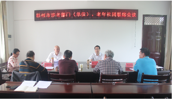 4月19日上午,梧州市委老干部局牵头召开涉老单位、老年社团联席会议。市委组织部副部长、老干部局局长杨安出席会议并讲话,市委老干部局、市关工委、市老科协、市老促会、 市老体协、市诗词学会、市老年大学的负责同志参加会议。