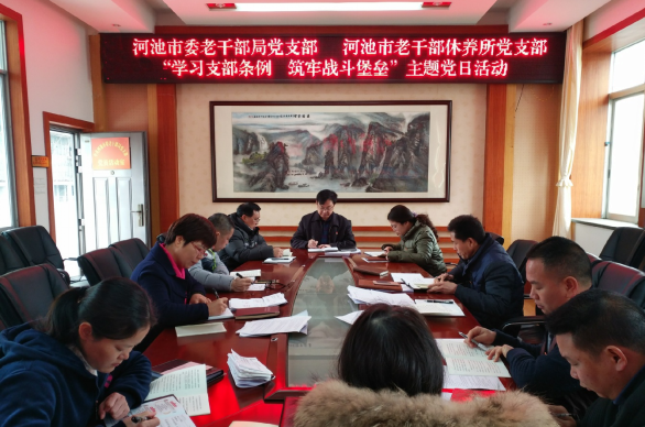 为全面提升党支部组织力,加强党支部标准化、规范化建设,2月25日上午,河池市委老干部局党支部和市老干部休养所党支部联合开展“学习支部条例,筑牢战斗堡垒”主题党日活动。