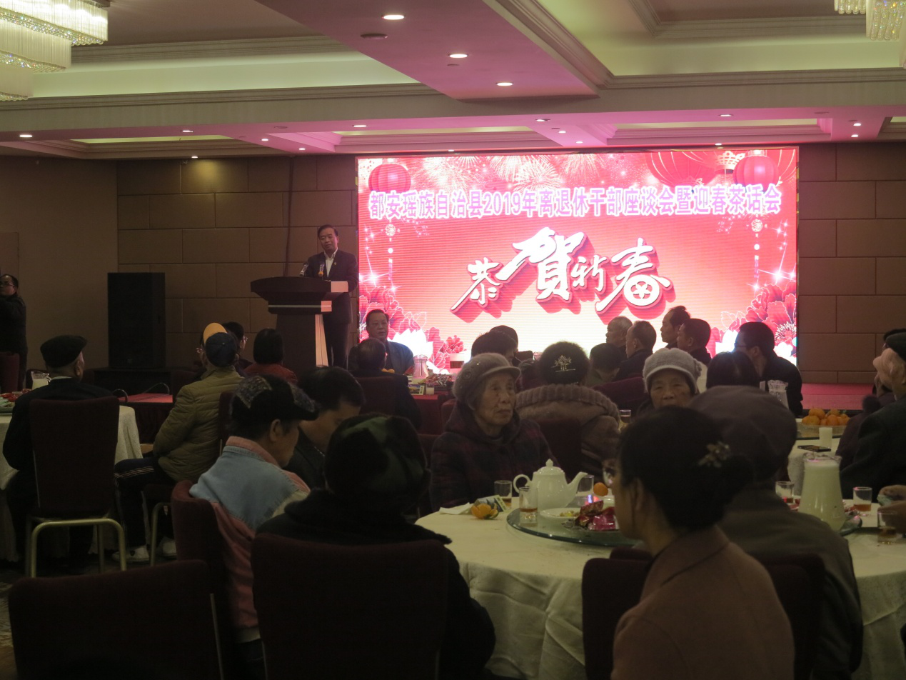 1月24日下午,都安瑶族自治县召开离退休干部座谈会暨迎春茶话会,县离退休干部代表、军警代表、科技突出贡献专家代表、劳模、道德模范代表、教师模范代表、脱贫攻坚先进代表、企业代表共160人参加座谈会。
