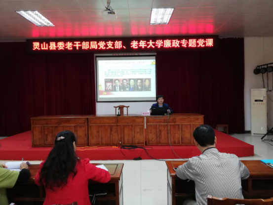 12月21日上午,灵山县委老干部局邀请县纪委党风廉政室主任陈冠华为离退休干部、县委老干部局党支部党员上了一节廉政专题党课,共150人参加了学习。