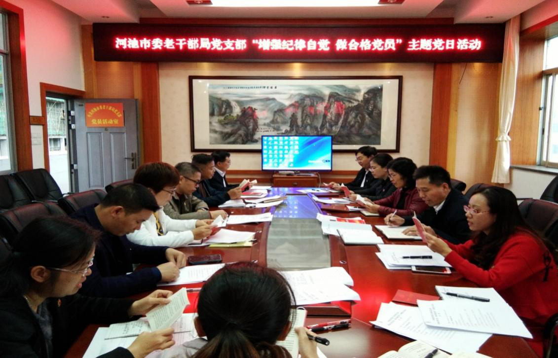 11月12日上午,河池市委老干部局党支部开展“加强纪律自觉做合格党员”主题党日活动,旨在教育引导党员干部进一步增强纪律意识、规矩意识,深入推进“两学一做”学习教育常态化制度化。局机关党支部、市老干部休养所党支部全体在职党员干部参加。