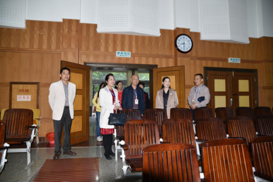 图为自治区老干部局验收组在实地察看市老年大学礼堂。