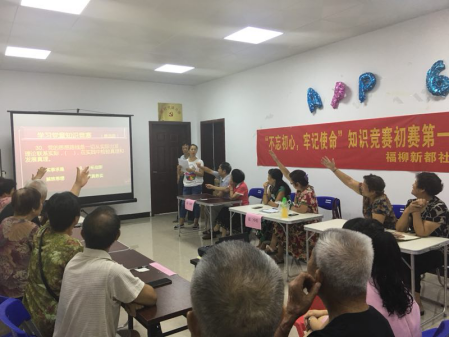 9月20日,柳州市城中区企离中心和福柳新都社区党委组织党员开展学习十九大报告和新党章知识竞赛活动。竞赛以“不忘初心、牢记使命”为主题,采取初决、赛淘汰制,本次进行的是初赛。活动共分两个答题环节:第一环节必答题,第二环节抢答题,题目分单选题、多选题、判断题、填空题、简答题,综合检验了参赛选手个人理论知识储备、现场应变能力和团队协作水平。同时,将观众答题环节穿插其中,极大地调动了现场气氛。比赛开始后,各参赛选手们迅速进入比赛状态、争分夺秒、认真答题,充分展现了老党员们良好的政治素质和精神风貌。参加比赛的选手最大年龄的是一位离休干部90岁。离休老同志热情饱满、认真答题,他们的精神风貌真正体现了离休不褪色的本色,令人敬佩。