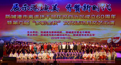 欢度重阳展示港城美,喜迎大庆齐赞新时代。10月17日,防城港市委组织部、市委老干部局在市文化艺术中心剧场联合举办全市离退休干部庆祝自治区成立60周年暨第六届“多彩金秋”文化活动月文艺汇演。市委常委、组织部部长袁国华,市人大常委会副主任、市总工会主席梁光,市政协副主席、党组副书记彭景东等市领导与老同志共贺重阳、喜迎大庆。