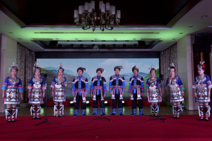图为颁奖晚会现场。 看山歌竞唱,品百家风情。此次山歌擂台赛除了开展精彩激烈的初赛、复赛及颁奖晚会外,主办方还组织山歌手及山歌爱好者到“广西民族团结进步创建示范点”三江县林溪镇冠洞村冠小屯,与当地的侗族群众开展山歌传唱交流,在感受侗族“腊汉”“婄更”歌声飞扬的同时,倾情品油茶、赏歌舞、跳多耶,老同志们则用不同民族语言的山歌激情欢唱,山村侗寨变成了歌声的海洋。