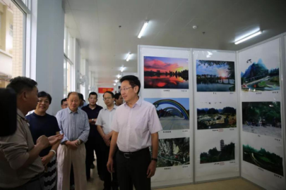 图为何书记在市老年大学书画摄影展示厅参观河池市第三届“寿乡红叶”离退休干部文化活动周书画摄影作品展。