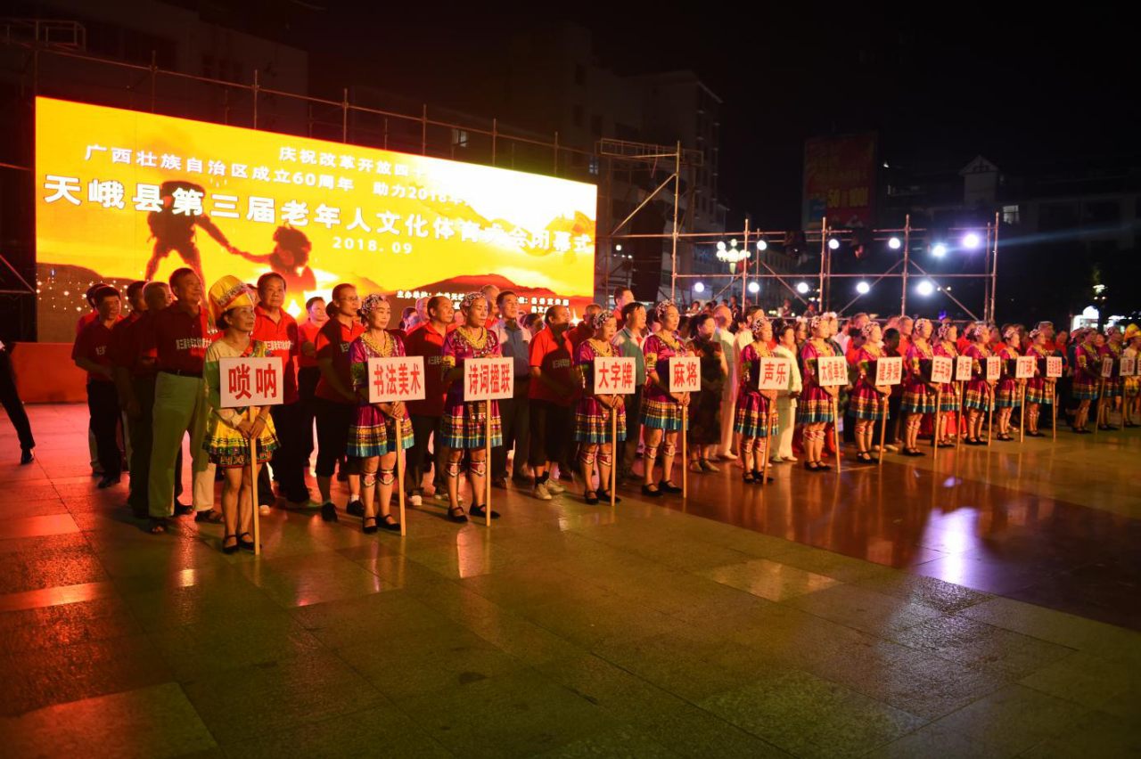 天峨县第三届老年人文化体育大会于9月1日开赛,历时15天,来自全县各乡镇、县直各单位以及县城区的老干部、老年人共800多人参加了各项比赛活动。比赛涉及广场健身舞、门球等16个项目,共有100多名运动员获得各项奖励。
