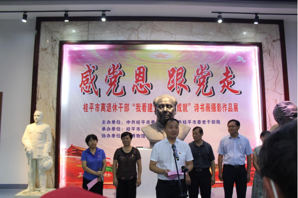 为庆祝中国共产党成立100周年,6月21日,贵港桂平市在市博物馆举办“感党恩 跟党走”离退休干部“我看建党百年新成就”诗书画摄影作品展。市委常委、组织部部长赵理到场与广大离退休干部一同参观作品展。