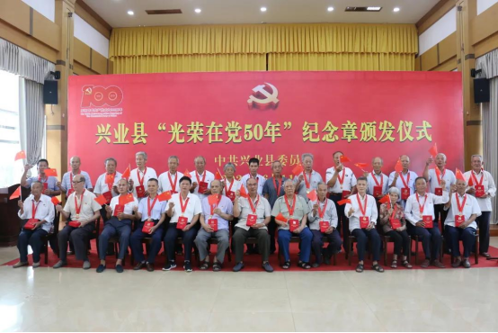 6月11日上午,玉林市兴业县举行“光荣在党50年”纪念章颁发仪式,为28名党龄达到50年的老党员代表颁发“光荣在党50年”纪念章。拥有52年党龄的老党员陈庆祥感慨地说,“党始终指引着我人生的方向,我将在卫生事业上继续发挥自己的优势作用。”据了解,兴业县各级党组织将向截至7月1日前党龄达到50周年的、健在的、一贯表现良好的2540余名党员颁发“光荣在党50年”纪念章,让他们能够感受到以习近平同志为核心的党中央的关怀和温暖。