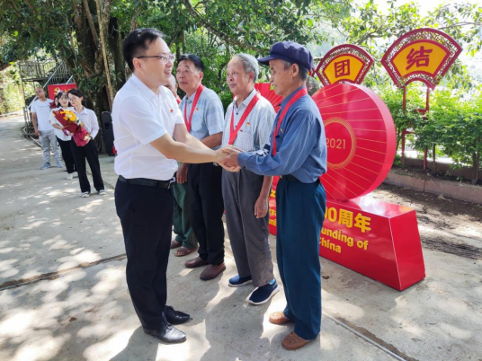 雷吒同志代表乡党委在上隆村红色革命教育基地大榕树下向参加仪式的老党员颁发了纪念章