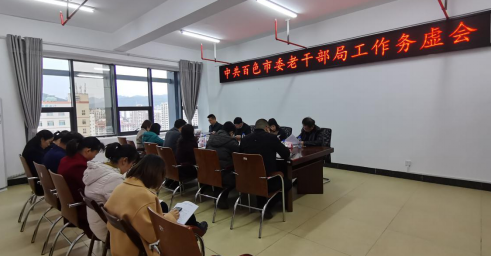 会议指出,2021年是中国共产党成立100周年,是实施“十四五”规划的开启之年,也是在全面建成小康社会之后,开启全面建设社会主义现代化国家新征程第一年。全体干部职工要结合实际,扎实做好离退休干部服务管理工作,充分发挥老干部的正能量,助力百色经济社会发展。一要不断加强理论学习,增强服务意识。要加强自身理论学习,提升素养,准确把握老干部工作在全局工作中的定位,更好地融入大局、服务大局;二要切实增强工作紧迫性,抓好各项工作。要主动思考,制定工作计划安排表,把服务老干部的各项工作想周全、想仔细,倒排工期,切实把每项工作落实落细落地;三要做好老干部工作调研,了解和掌握老同志的需求。要深入开展工作调研,主动加强与老干部的沟通联系,了解他们的所需、所盼、所求,虚心听取老干部的意见建议,在广听诤言、广纳良策中完善和创新发展思路。四要统筹推进,推动工作上新台阶。要牢固树立全局观念,充分发挥职能作用,统筹推进各项工作,推动老干部工作提质增效,真正做到让党委政府放心、让老同志满意。