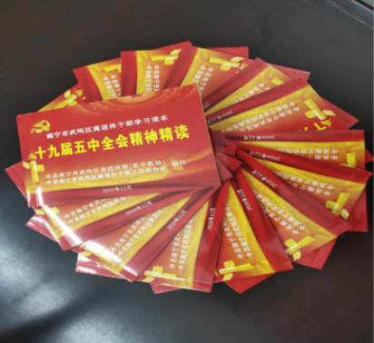 日前,武鸣区委老干部局精心制作“口袋书”—《党的十九届五中全会精神精读》,送到城区离退休干部手中,引导离退休干部学习好、领会好、贯彻好全会精神。